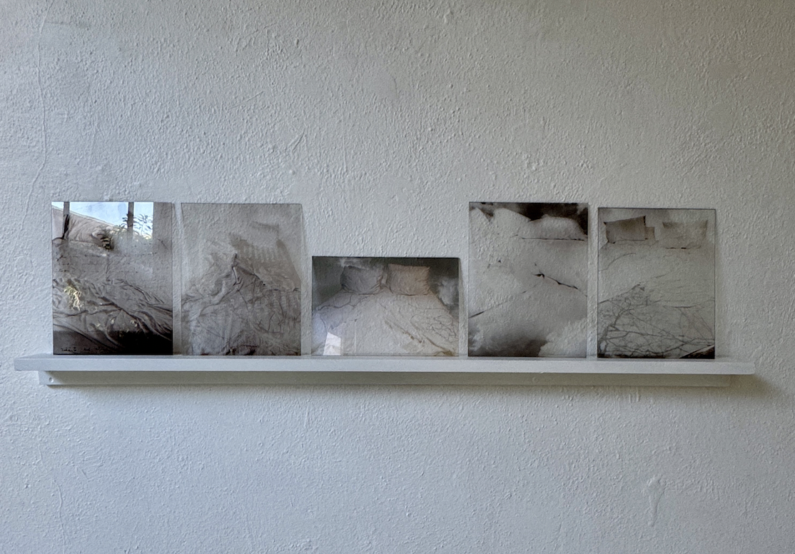 In the Echo of (Our) Absence, Fabiola Ubani presents five photographic glass works arranged along a shelf. A recurring image of a bed moves across each panel, the forms subtly merging. The glass lends fragility, reinforcing the ephemeral nature of intimacy.