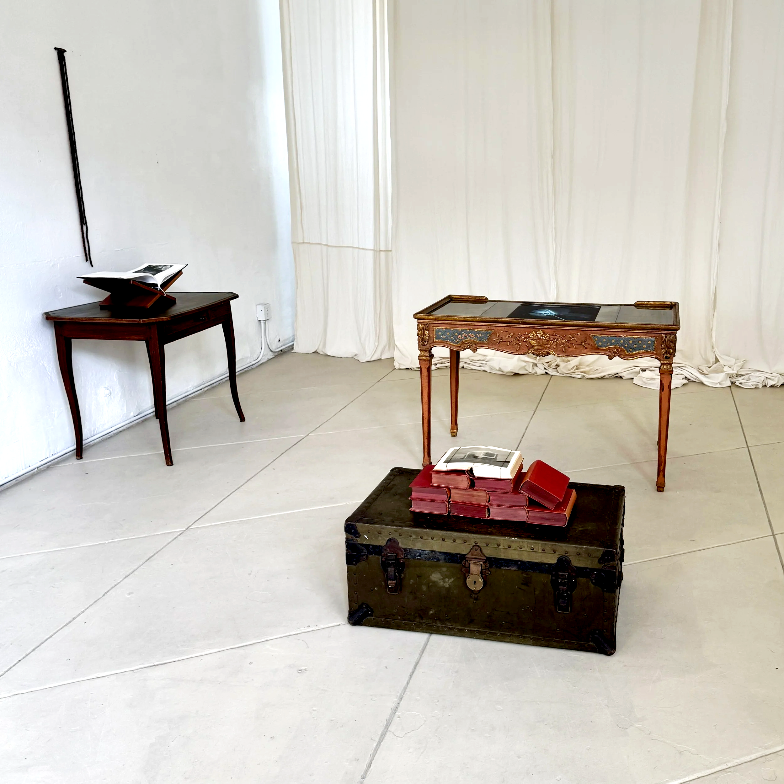 Silvia Gaffurini presents a different work than in the Italian exhibition: The Eight Lamp (2021–2024), a single transparent and embossed photographic page bound within a book and placed upon a stack of volumes, where photography becomes both page and object. Olga Caldas similarly approaches photography as a tactile artifact, presenting a handmade photobook as sculptural form.